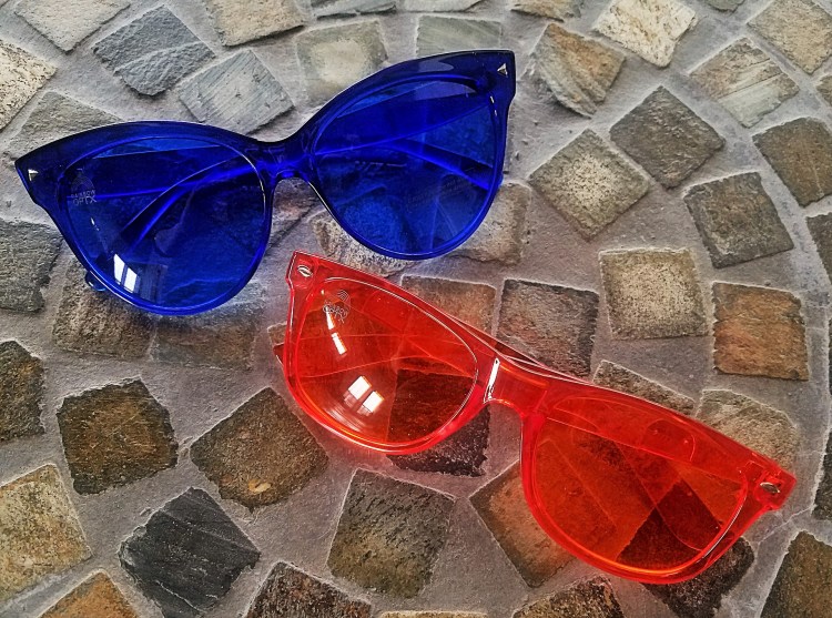 Initially, each pair of sunglasses needed a little bit of an adjustment period- since I’m so used to wearing shades with black/gray lenses. To suddenly see the world through a bright blue or fluorescent orange hue was a bit of a shock at first. But, as my eyes adjusted and I went about my days (I tried each pair for a couple of days at a time to try and accurately detect/record any difference in my mood and overall head space)– I have to admit that I felt pretty relaxed and calm while I wore the blue shades.