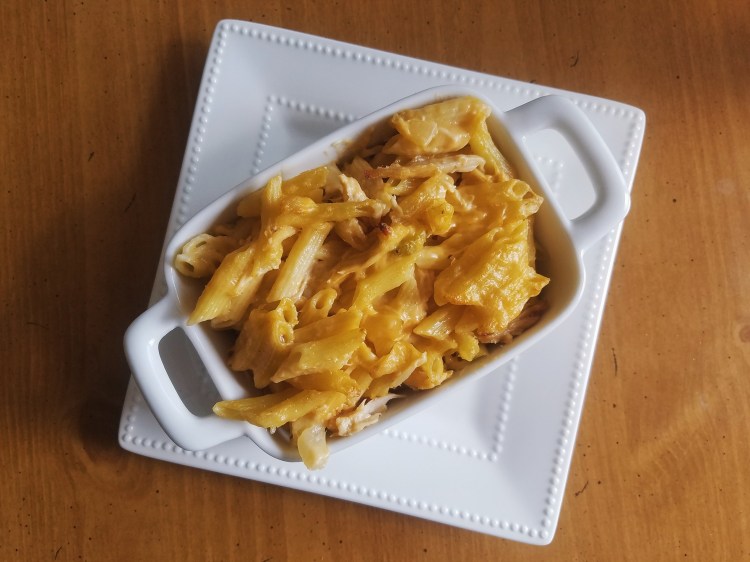 Not all hope is lost, of course. While I can’t enjoy rickety roller coasters and Ferris wheels until next Summer/Fall- I can still make some of the beloved fair food I’ve come to enjoy over the years. For example, this past weekend while in the mood for some warm comfort food- I decided to try my hand at whipping up the aforementioned gourmet macaroni and cheese. Infused with plenty of buffalo chicken, this is an ideal Game Day/Super Bowl party dish, too.