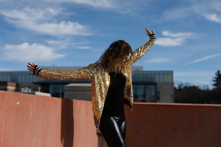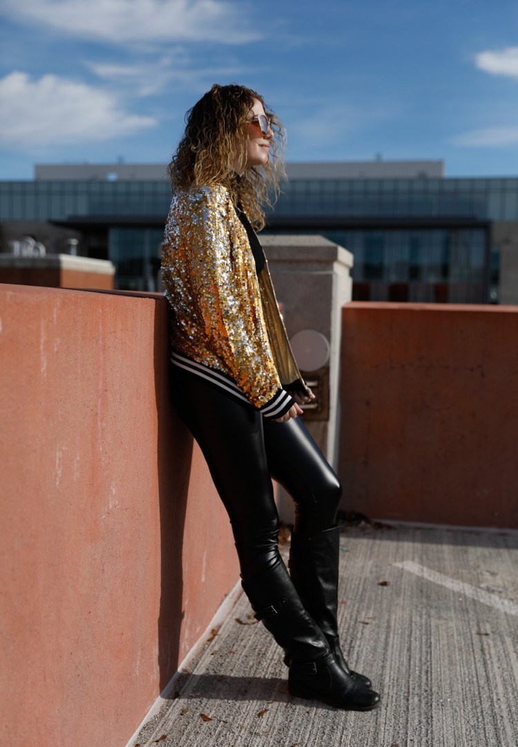 This gold sequined, zip-up bomber jacket by Anna-Kaci, a piece I don’t get to wear out often these days given the ongoing pandemic- catches the light from all angles and actually keeps me pretty warm when zipped fully- even in a harsh New England Winter!