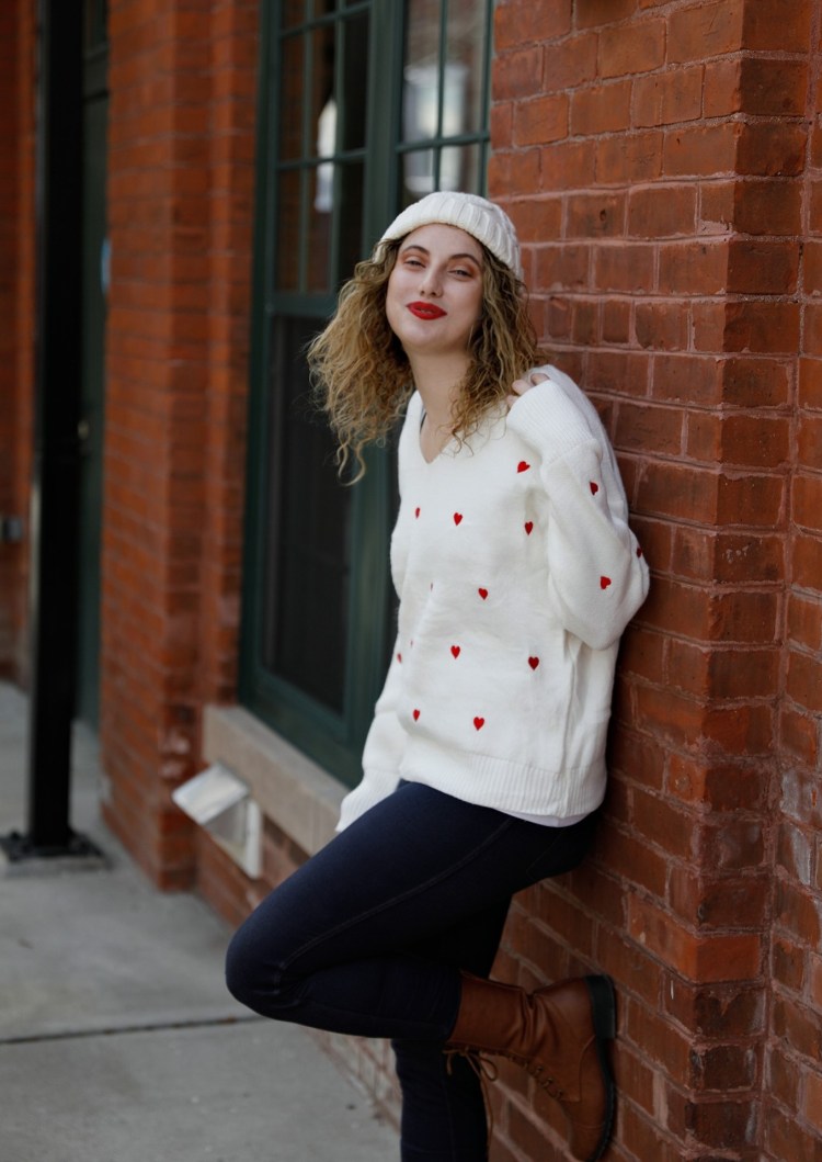 And if I do happen to wear this out on Valentine’s Day- be it to grab a coffee or run an errand before I settle in for the night- I’m going to accessorize with my knitted white hat (since I’m overdue for a root touch-up by my stylist) and my signature red matte lipstick.