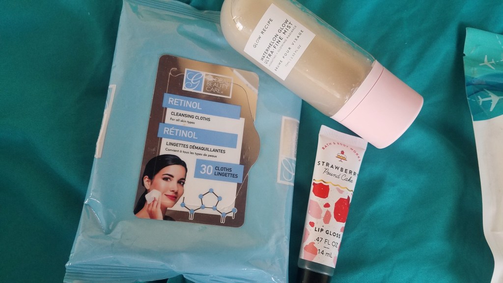 Pre-COVID, I would wear a little makeup on any flights I was boarding- but with mask wearing still required when not eating/drinking- it seems a little pointless to put on anything other than a bit of concealer or mascara to keep me looking fresh-faced and awake until I arrive at my destination. That means that while I’m up in the air, keeping my skin hydrated is the priority- especially since it’s not just my hands that tend to dry out while I’m soaring over the States. These Retinol-infused facial cleansing clothes from Global Beauty Care are great at swiping away excess oils, dirt and/or sweat mid-flight- and are followed up immediately with a quick spritz of my Glow Recipe Watermelon Ultra-Fine Mist to keep my skin glowing and balanced.