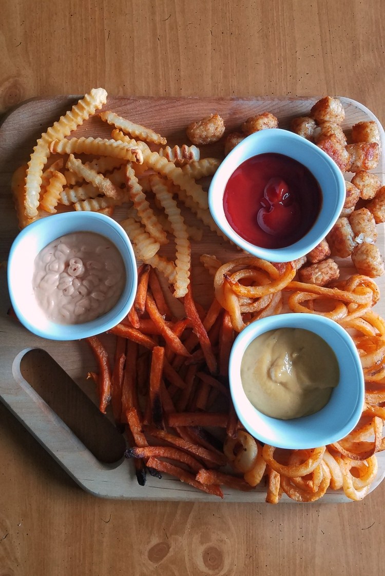 2. While the fries are cooking, scoop/pour the condiments into small bowls for serving. When the fries are done, arrange them with the condiments on a serving tray or board (like you would with a standard charcuterie board) and enjoy!