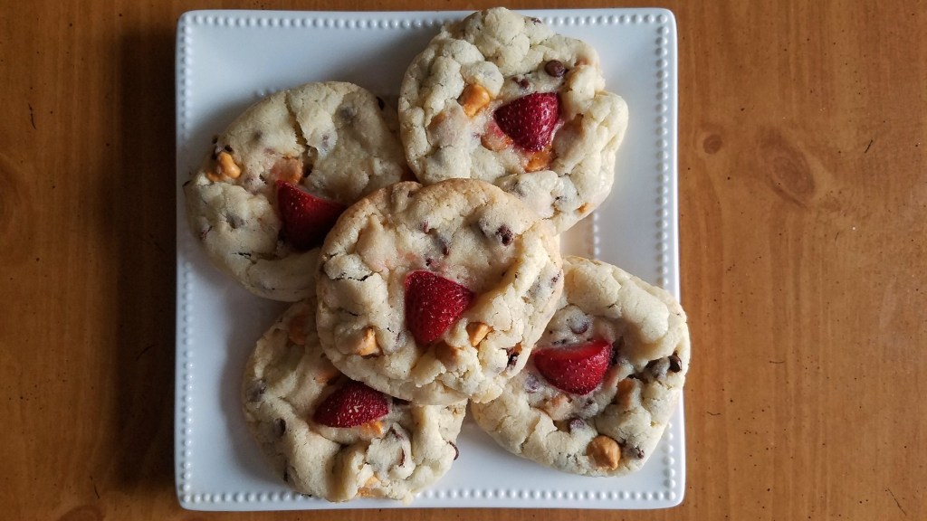 These cookies were so much fun to make and even more fun to eat. The banana extract and the walnuts really take the flavor to a new level- and the strawberry added just the right amount of tartness to bring it all together without making the cookies too sweet.