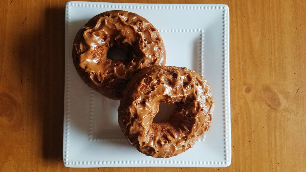 6. When the donuts are done, cool for 10 minutes and dip the tops into the glaze. Allow glaze to set before serving.