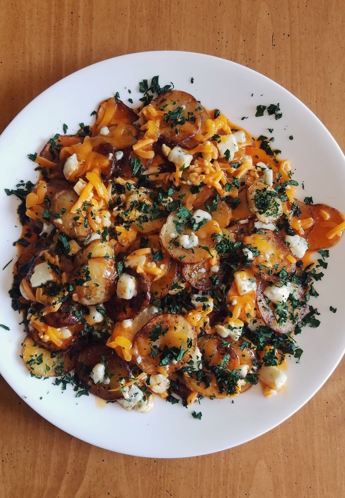 Nachos have long been my favorite go-to for Monday/Thursday/Sunday games and the Super Bowl each and every year- and I’m always looking for different flavors and versions to incorporate and try when whipping up a batch for myself or guests. These nachos, built on slices of roasted potatoes instead of the usual tortilla chips- are a flavorful, filling and completely customizable appetizer that is sure to be a crowd pleaser- regardless of which team you’re all rooting for!
