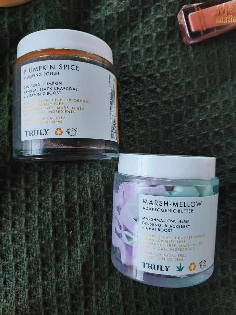 The bundle includes “Plumpkin Spice” Plumping Polish. Infused with gold, vanilla and Vitamin C- this body buffing scrub sloughs away dead skin cells without being overly harsh or drying out the skin and while simultaneously smelling exactly like a Starbucks PSL.