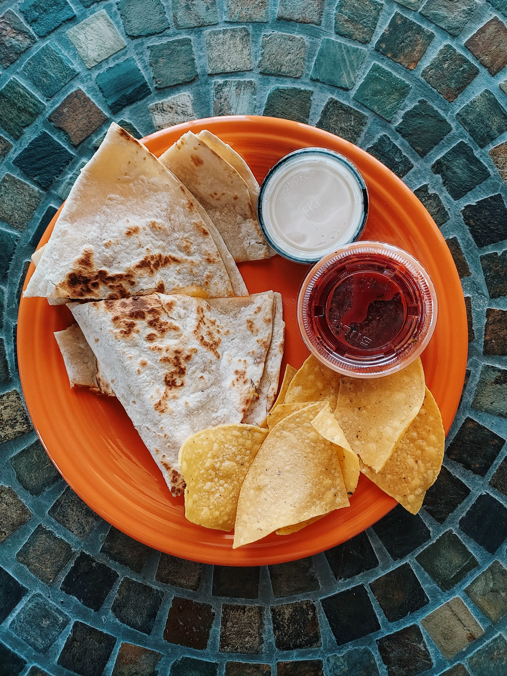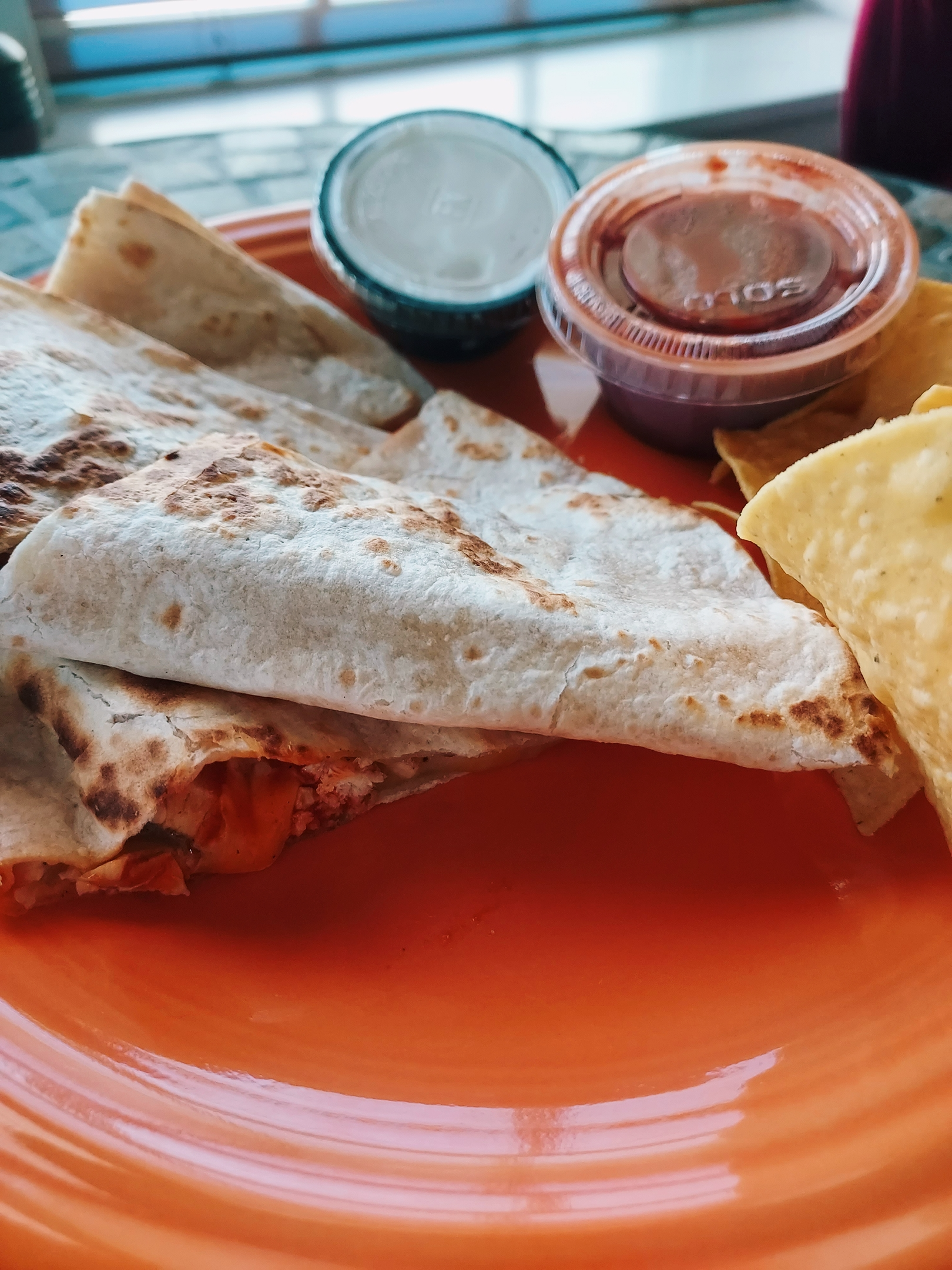 Earlier this week, wanting some carbs and a kick of spice- I grabbed a couple of favorites from the menu to bring home with me during my lunch break- the buffalo chicken quesadilla and a small bag of their warmed tortilla chips (with guacamole, of course!) As always, the staff were friendly and fast with getting me my order- and everything tasted delicious.