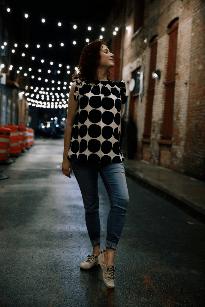 When I made plans to return to Troy, New York to celebrate my friend Dan’s birthday with his family and some of his friends this past weekend- I knew exactly what outfit I wanted to wear since I had been waiting for both the right weather and the perfect occasion to finally show it off. Not too formal, but still a little more fancy than any of my t-shirts I usually toss on when my afternoon is going to consist of pizza and margaritas- this short-sleeved (with ruffled details!), satin blue and white polka dot top was the perfect thing to pair with jeans and some slip-on sneakers.