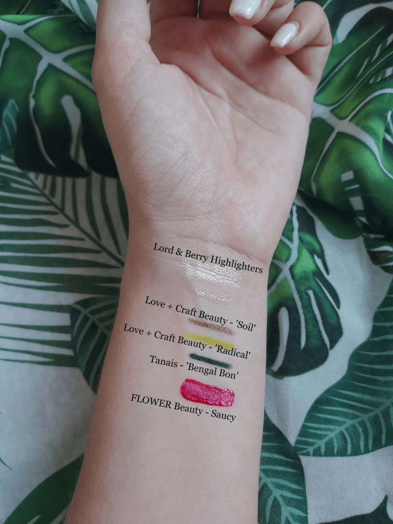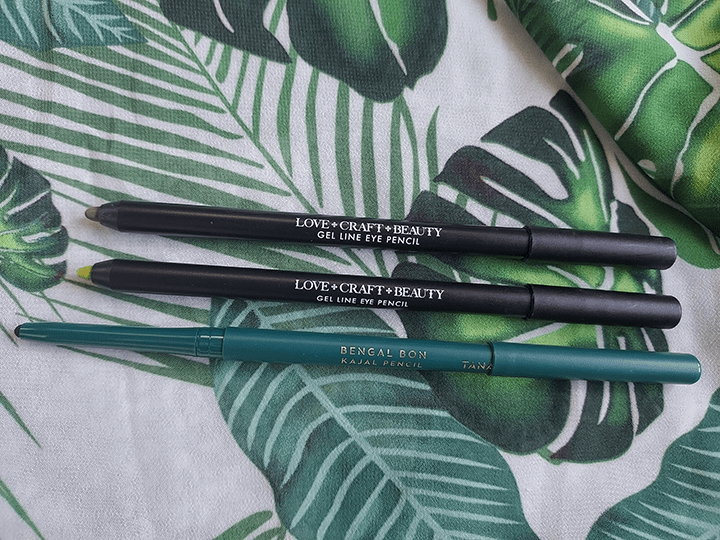Two of my liners are from Love + Craft Beauty. There’s ‘Soil’, a gorgeous metallic brown- and ‘Radical’, a highlighter-yellow/green. Both formulas are gel pencil, meaning they apply easy and evenly without painful scratching or tugging.