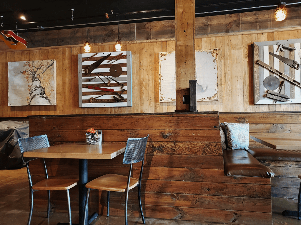 Part coffee house, part fully-functioning cocktail bar and part gallery/artisan showcase and live music venue- all within a space designed to feel like a refurbished saw mill- Saw Dust Coffee House features an extensive menu of food, beverages, seasonal treats and more. There’s plenty of comfortable seating both indoors and outdoors, work space for those looking to plug-in and plug away while working remotely or doing some catch-up (as I did over the weekend!) and a spacious bar/lounge area across from a small performance center for live singers/songwriters and bands.