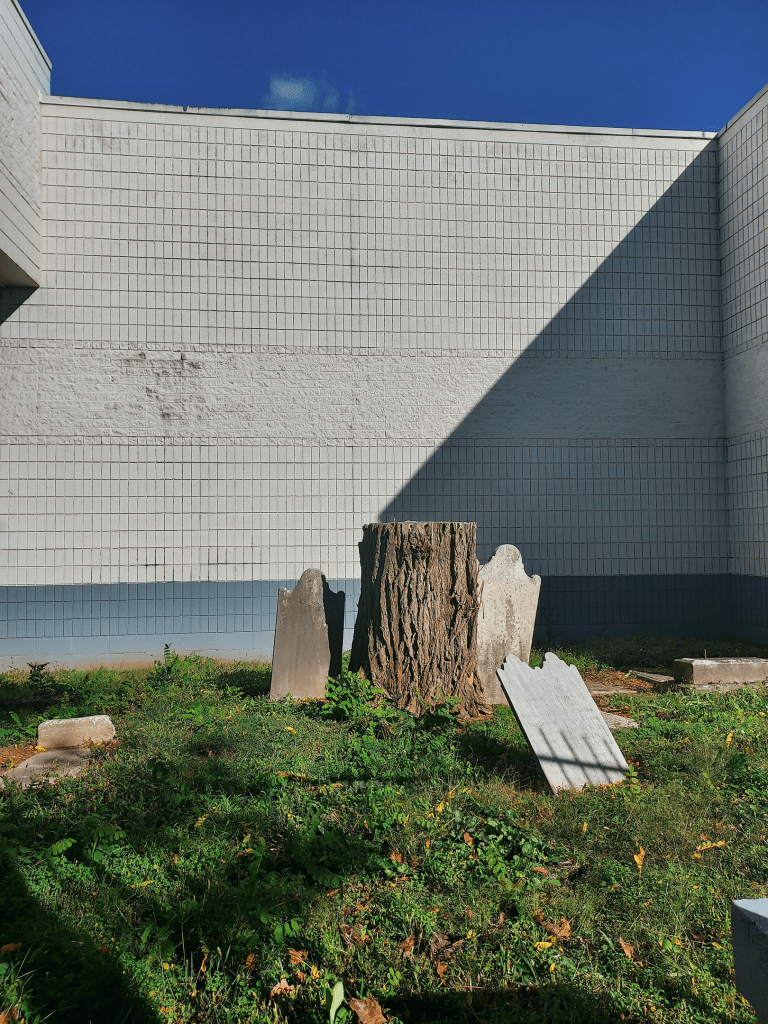 Instead, the mall built a gate and fence around the graves with a placard acknowledging it’s importance to the town’s history- and it now stands just outside a movie theater entrance way. It took a little searching around the plaza (which was more spacious than I anticipated)– but we found it!