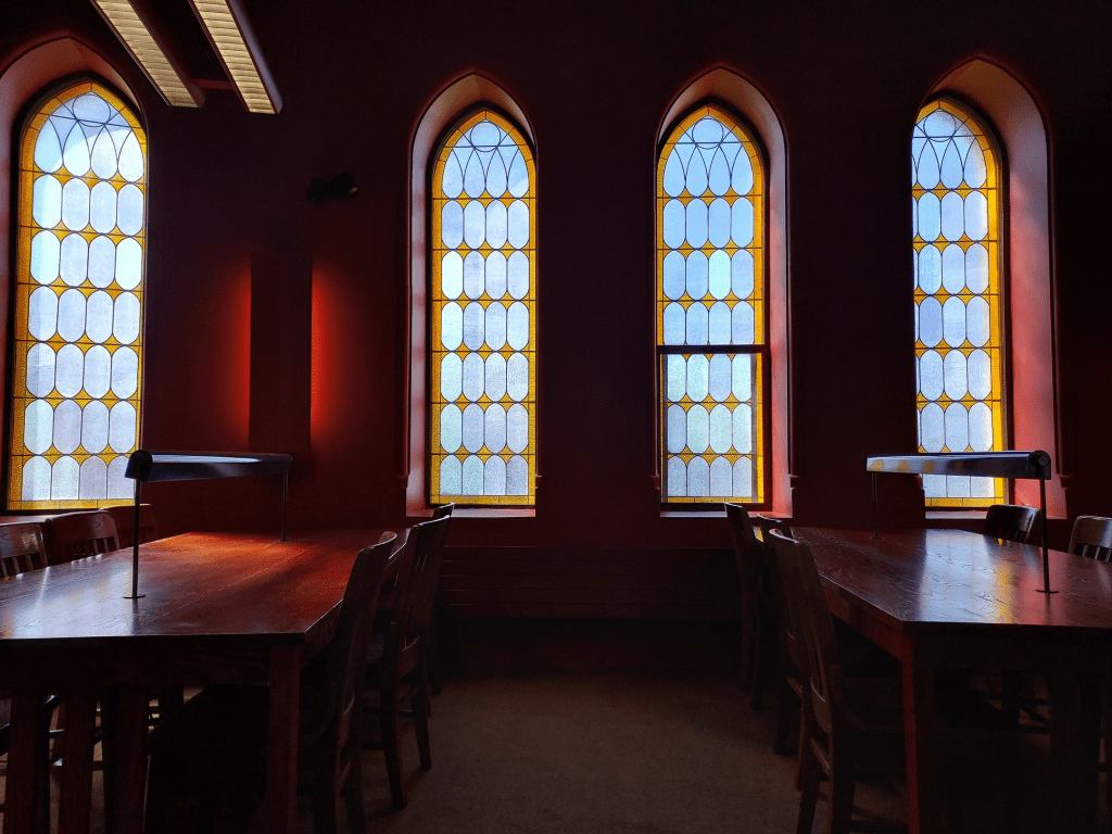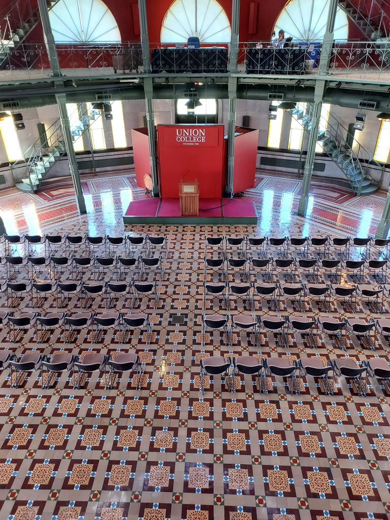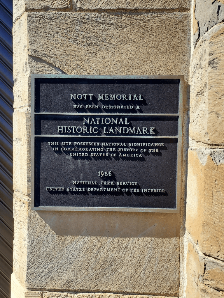 The next day, when Troy was finished up with his conference and was all packed up to head back East to New England- we stopped by Union College to check out the Nott Memorial- which had been pointed out to me as a place of interest while I was in town. This 16-sided stone-masonry building, dedicated to former and long-time college president Eliphalet Nott- is a stunning lecture hall, art museum and study space with beautiful stained glass windows and a detailed dome.