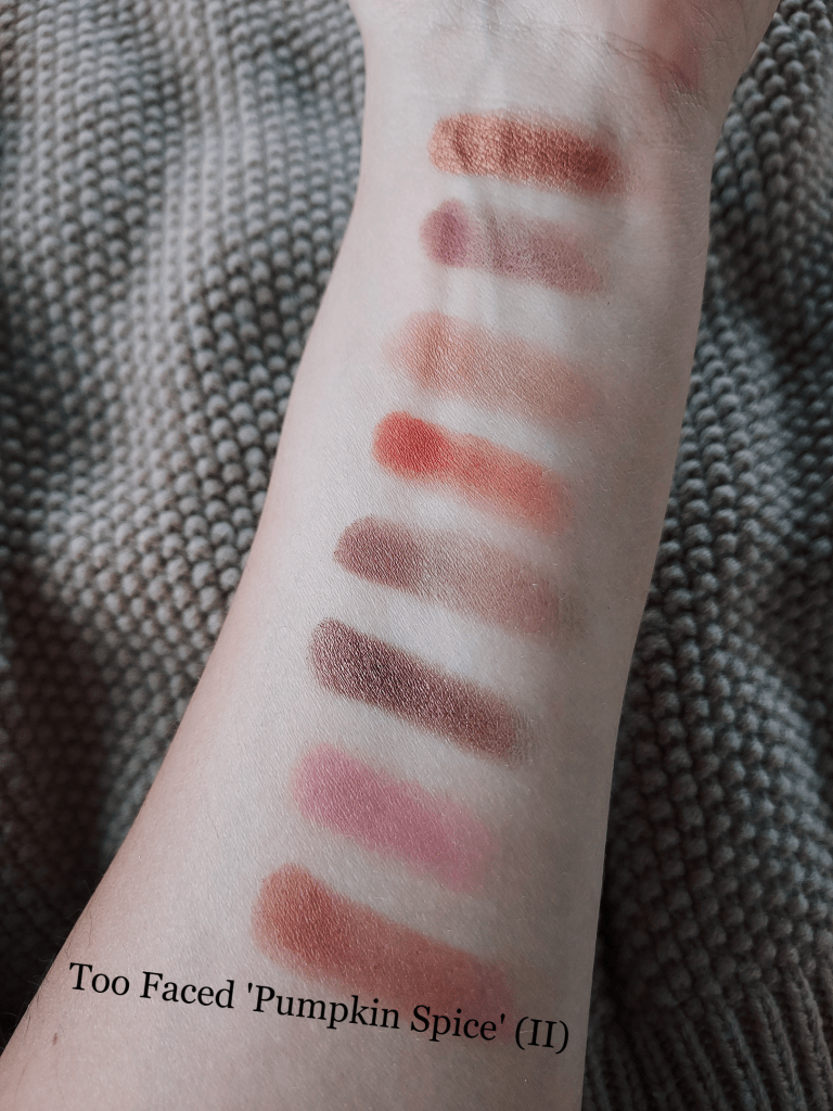 I had talked about this Too Faced eyeshadow palette in my recent September “Favorite Things” post– but I’m excited to share some swatches for it here! With a mix of beautiful and pigmented metallic, glitter and matte-finishes, all with adorable names- these shadows apply smoothly and don’t crease, crumble or fade when used with a primer.