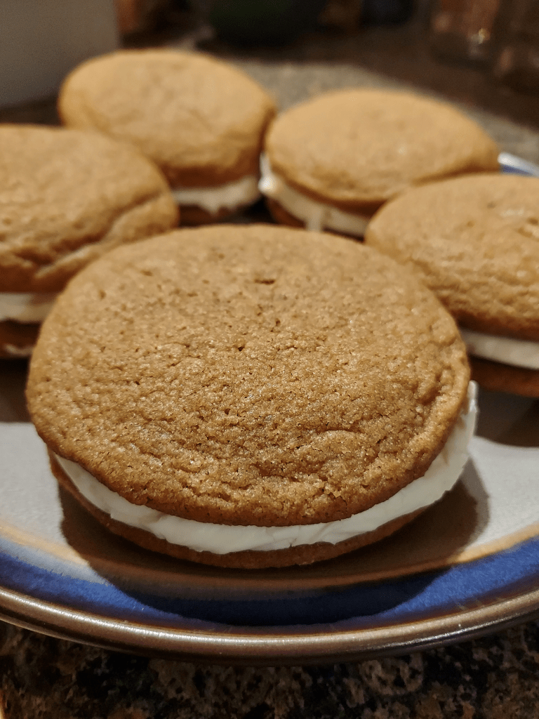These whoopie pies are so full of delicious flavors and have such a fluffy texture that it’s extremely difficult to eat just one. I recently brought a batch of these over to dinner at my friend’s house to serve after she put together a wonderful main course for us all- and I was so pleased to see how much everyone enjoyed them!
