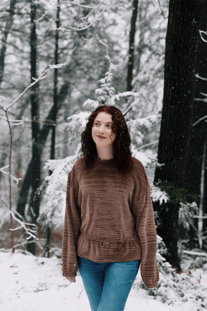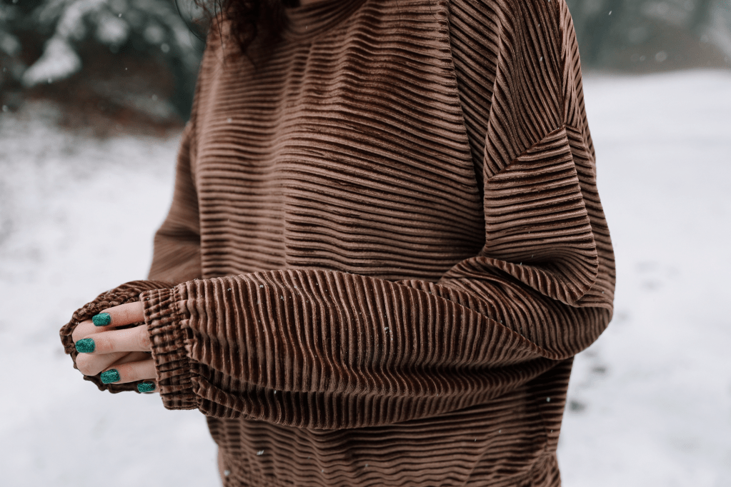 This puffy, brown and velvet sweater- a couple of sizes too big on my frame but oh-so-comfy nonetheless- was surprisingly warm enough to wear out on the trails with no coat (although I brought one with me just in case!) The fabric is a bit heavy, making it a perfect piece for the colder days throughout Winter, and the inside is lined- so there’s no itchiness or irritation when I’m outdoors for any extended period of time or warming up by the heater when I eventually make my way back inside to the comfort of my apartment.