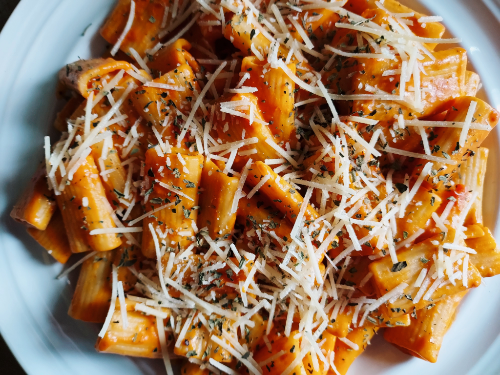 4. Transfer the drained pasta into the sauce and return to medium-low heat. Add about ΒΌ cup of the reserved pasta water, stirring to coat the pasta and loosen the sauce. Add more pasta water as needed until the sauce is glossy and coating the noodles. Serve garnished with fresh basil and Parmesan cheese.