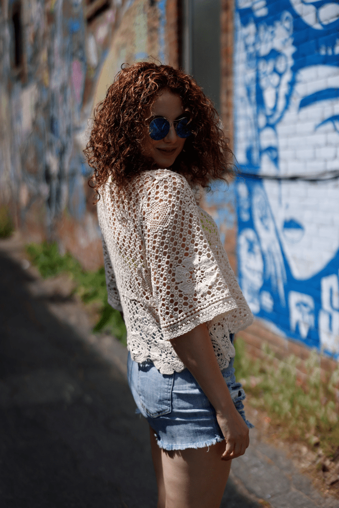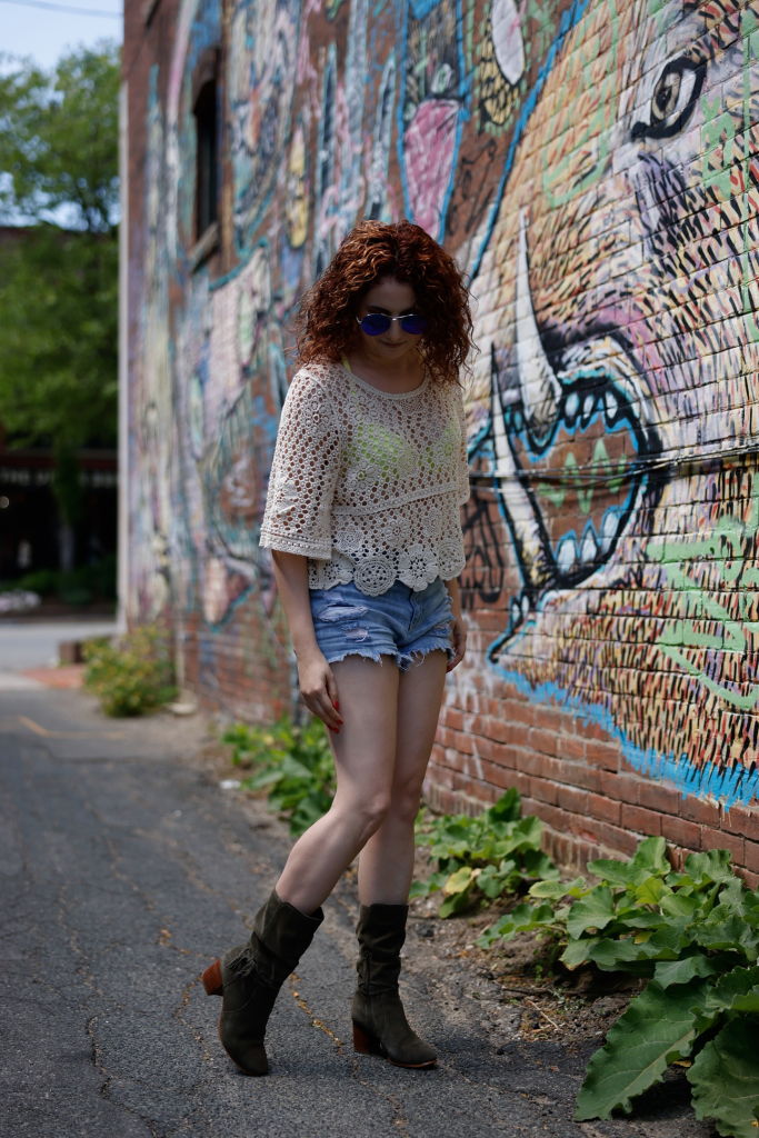 So this year, with high temperatures and sunshine in the forecast- I’ve opted for loose layers and light fabrics- like my stretchy, distressed denim jeans and a billowy, bell-sleeved crochet crop top that I’ve been tossing on over brightly-colored bras and bikini tops. If it gets too hot, the crochet can come off- and I just look like someone working on their tan.