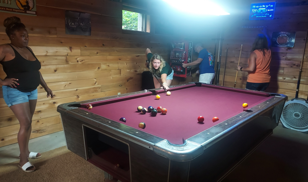 And it was so much fun! The cabin was gorgeous and legitimately miles from civilization- which meant we could be as rowdy as we wanted without worrying about disturbing any neighbors. We had great pizza, plenty of alcohol, a huge and refreshingly cool swimming pool to splash around in, a pool table where we got a little too competitive near the end of the day- and miniature goats. Yes, you read that right. Stef’s mother-in-law has miniature goats!