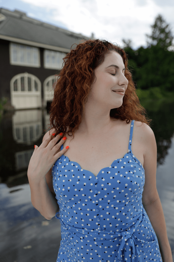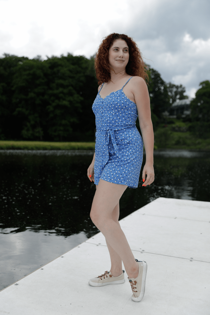 For the occasion, and as I lean into my “Coastal Granddaughter” era for the month of June (I haven’t gone to the Cape often enough to earn the title of “Coastal Grandmother” yet), I wore this absolutely adorable powder blue romper with white and black polka dots, a tied waist, blink-and-you’ll-miss-them buttons down the front, and scallop-cut neckline. It’s super comfortable, lightweight – which is ideal given how hot it gets! – and the cinched waist flatters my figure. I love it.