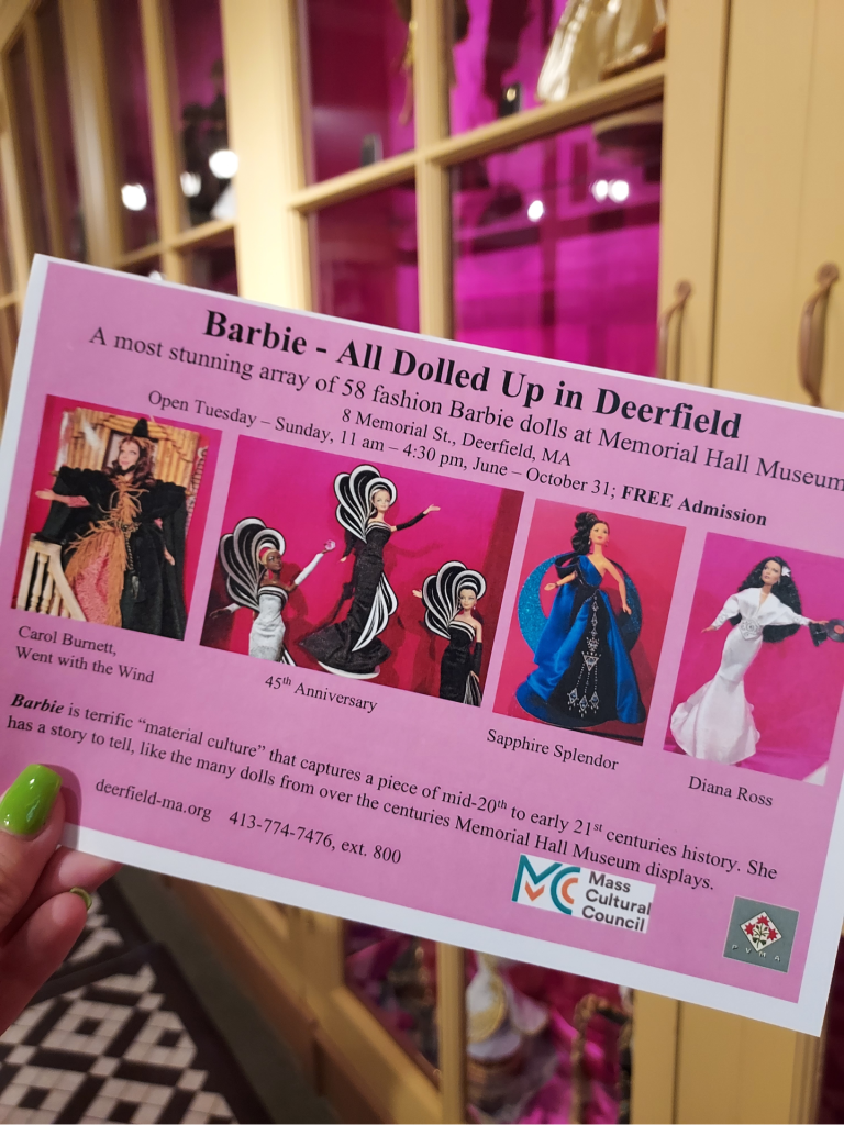 I put some time aside to have some fun, of course. While getting my heart pumping during a late morning walk in Historic Deerfield yesterday, I spotted an advertisement for a Barbie Doll fashion exhibit at the Memorial Hall Museum (which I haven’t been to since I was a little kid!)