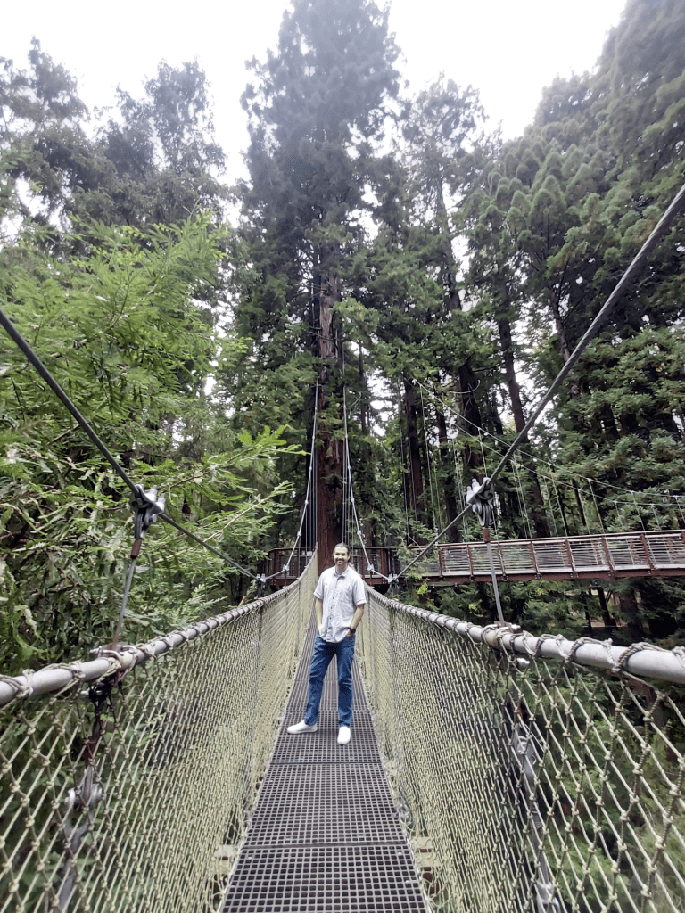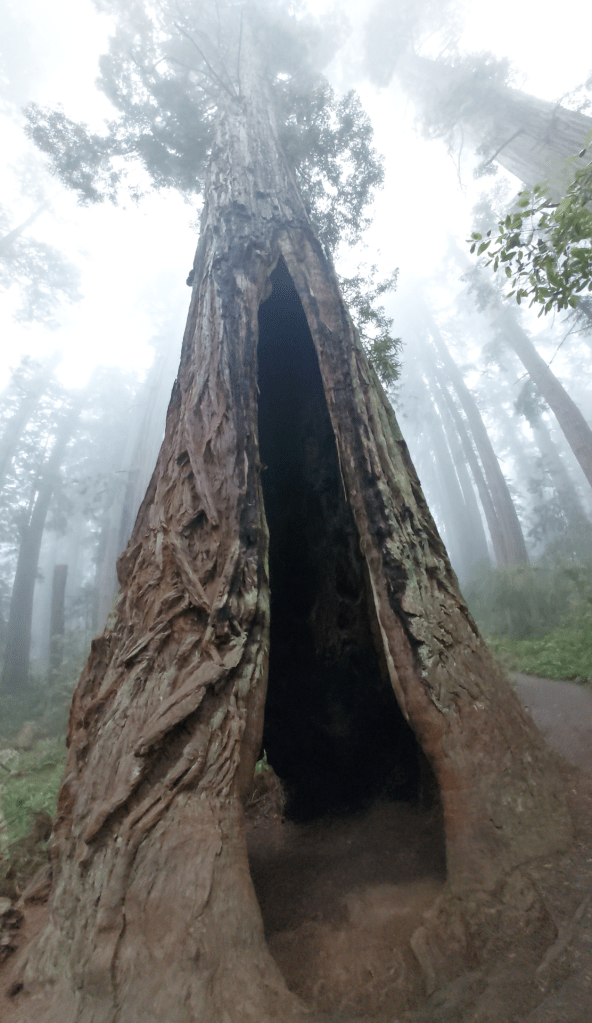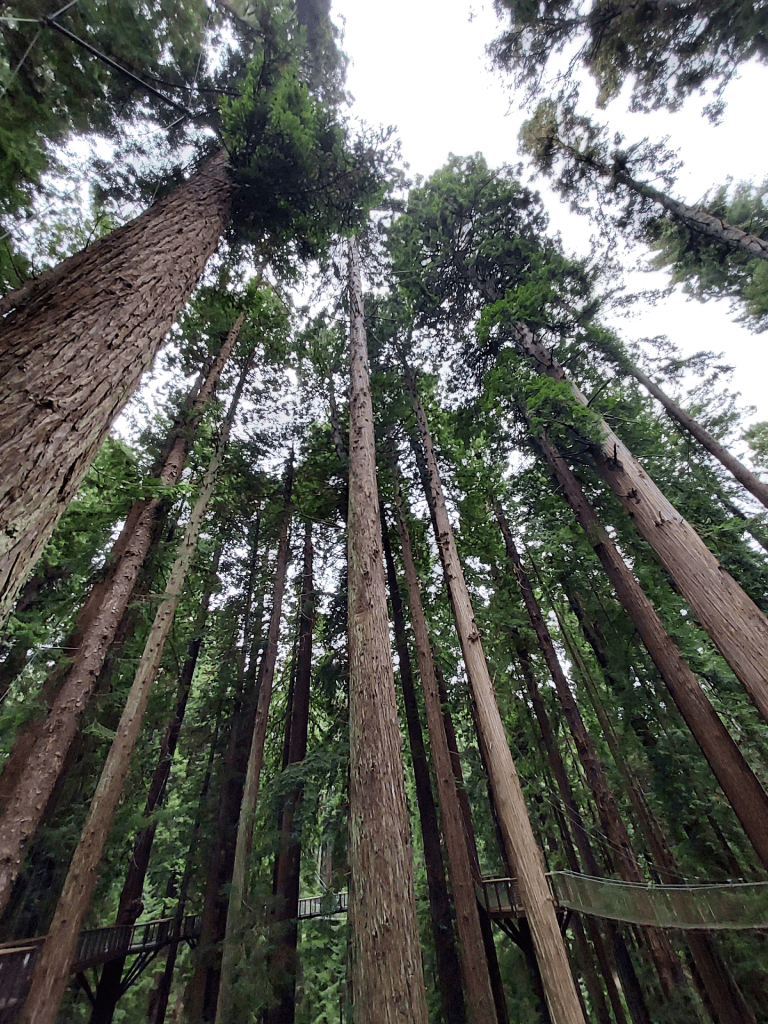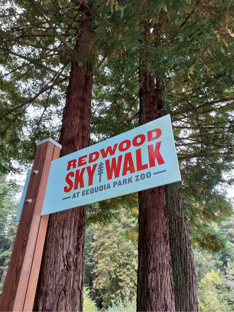 But after a long day on the road, we finally reached Eureka, California – and a considerably cooler, cloudier and rainier climate. Our first stop before checking into our hotel was to visit the Redwood Skywalk, located within the Sequoia Park Zoo, and the surrounding trail. I’d never seen a Redwood tree before, at least not in person – so while I knew they were big – I didn’t realize how big. Troy has plenty of photos of me looking bewildered and awe-struck as I’m staring up at them from both the ground and from the catwalk the Park Zoo had built between a few of them. They are MASSIVE, and absolutely incredible!