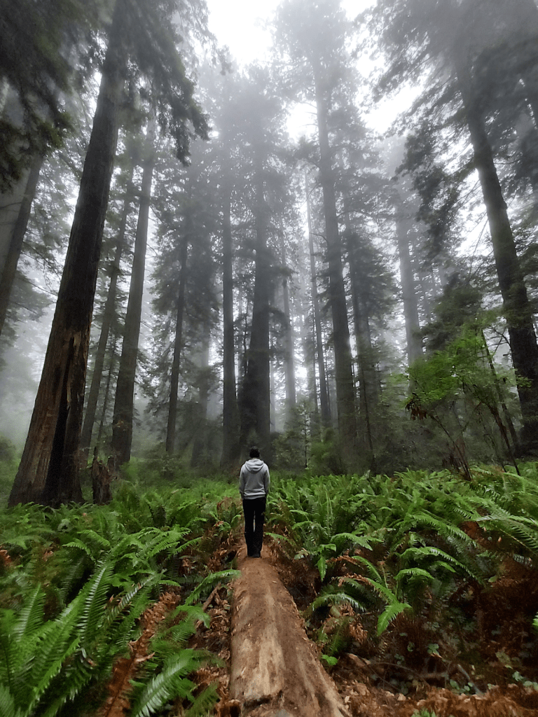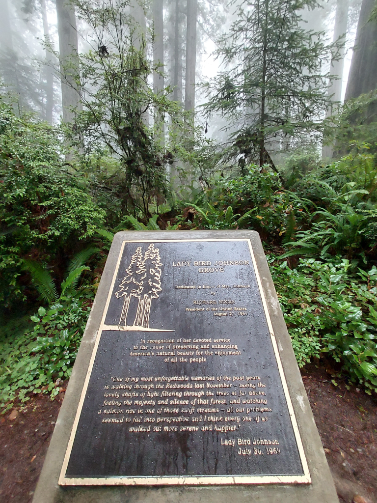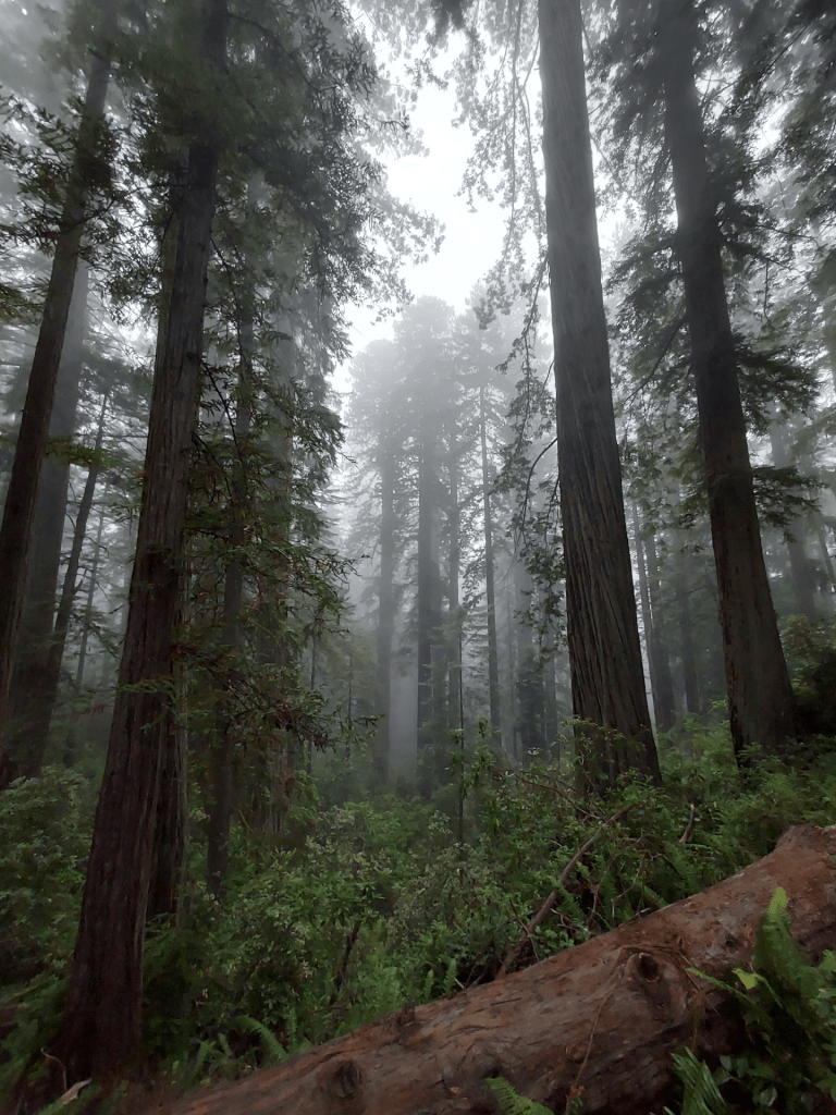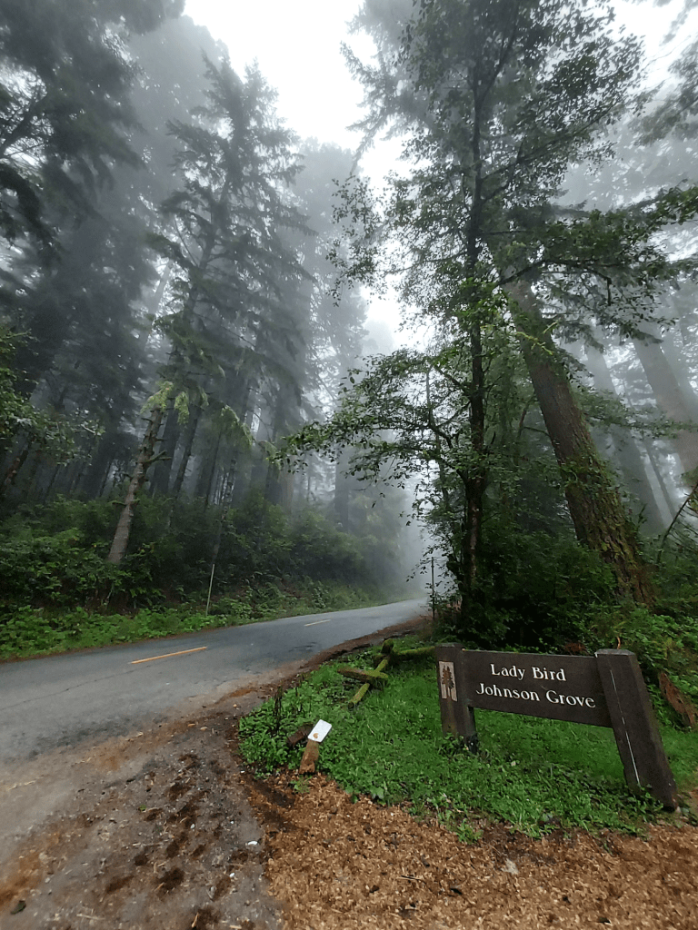 On Sunday morning, we again woke up early and hit the road after grabbing breakfast at our hotel to visit the Lady Bird Johnson Grove Trail in Orick, California. Winding in a loop for just over a mile, this trail passes even more colossal Redwoods, fern groves, and fields of clovers. And while we did have to stop while in route to the trail for a massive herd of wild elk that were settling into the downtown area of Orick for the day, we didn’t encounter any other wild animals (or really any other people!) while on the actual pathway. I think the rain had something to do with it – although the Redwoods were so big and stretched so high that we barely got wet at all.