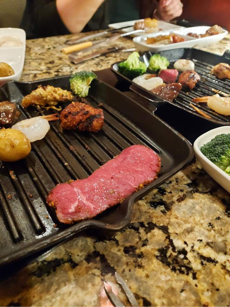 Since those experiences in what felt like an eternity ago, The Melting Pot locations in New England have dwindled down to one – a beautiful spot in Bedford – and their menu has expanded to include grilling and hot pot options, too. While we enjoyed dunking bread and vegetables into various cheese mixtures as an appetizer – we also got to grill plentiful portions of steak, chicken and pork on our table top stove and then finished the evening with a s’mores chocolate dip where we had a selection of brownies, Rice Krispie Treats, and fresh fruit. So satisfying!