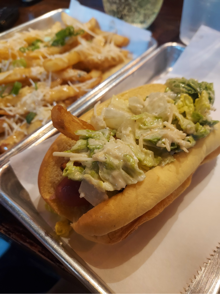 While their drink and cocktail menu is extensive and impressive (especially their espresso martini selections – any of which can be turned into a gigantic martini served in an equally gigantic glass to share with friends!) it’s their food and unique hot dog concoctions that have kept me coming back on my “cheat days”. This past weekend, for example, I stopped in post-surprise-snowstorm and during a torrential downpour that prevented me from going to the gym, and decided to try their “Girl Dinner Dog” that I’d recently seen advertised on their Instagram…