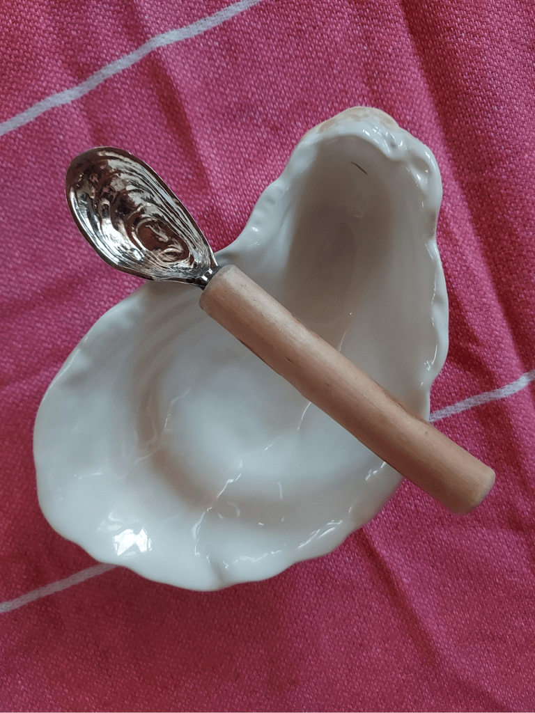 If you thought I was done collecting trinket dishes this season, you’re sorely mistaken – especially when one like this oyster-shaped dish also comes with a matching spoon to go with it!