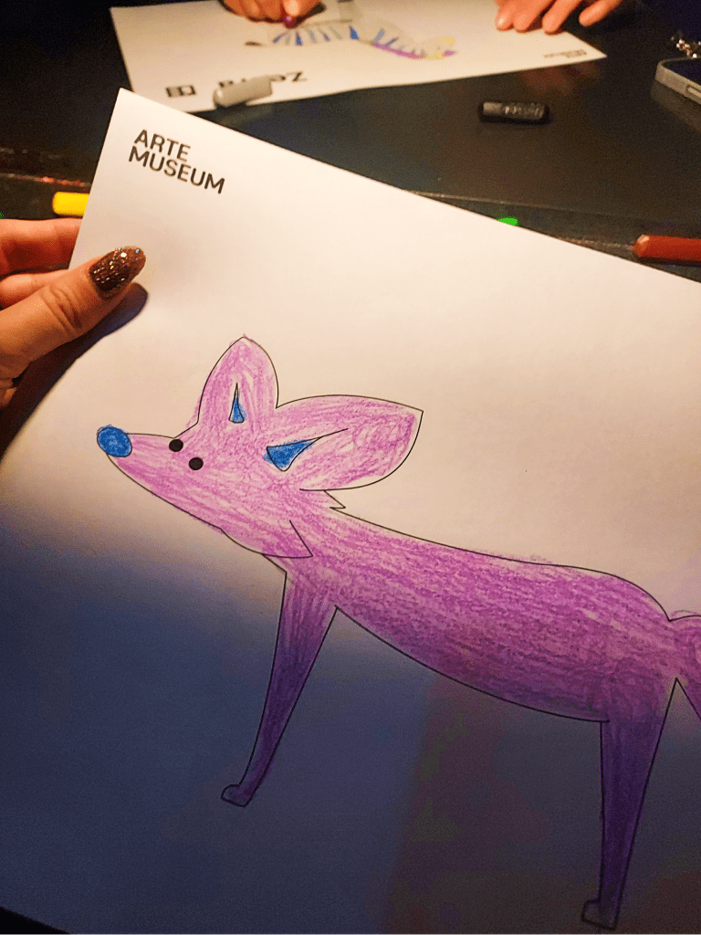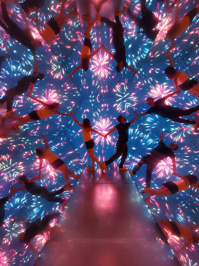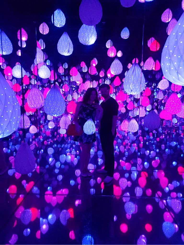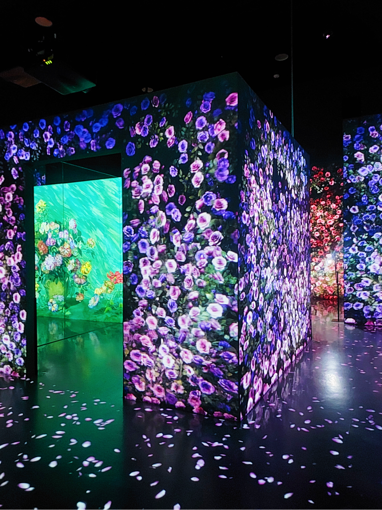 The first, Arte Museum, is an immersive gallery that brilliantly uses both large and small spaces, timed music/sounds, and digital imaging along with coordinated lights and mirrors to create an awe-inspiring immersive experience. We spent hours in there just marveling at everything as we explored from room to room, hallway to hallway. My favorite places to just sit and stare were the paper lantern room and a wrap-around Van Gogh tribute – but I also adored the “Live Sketchbook” room, where you could color pictures of different animals, scan them, and then watch them come to life and roam the walls around you!
