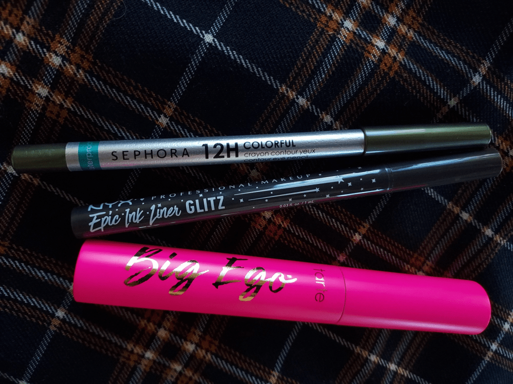 I’ve also been wearing more eyeliner this Fall, having found two drug store formulas that are long-lasting and easy to apply. The first, from the Sephora Collection, is a super soft and waterproof cream pencil in a shimmery dark green and pops when glided on next to the golden eyeshadow.