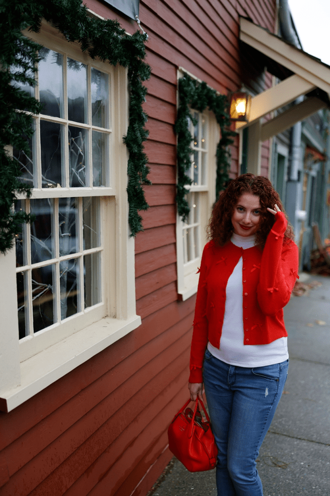 So with that in mind, I’ve already started leaning into my more festive options for outerwear and cute, cozy tops to sport at holiday functions and parties – including this red, button-up cardigan from A New Day, which features a ton of cute little red bows all over it – which is perfect for someone like me who enjoys looking like a Christmas present throughout November and December.