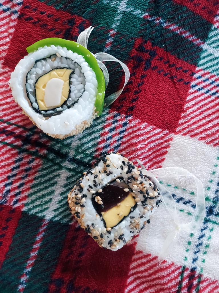 Finally, so many of the ornaments on my tree have been gifted to me by friends and family over the years, and it’s always a treat to unpack them and find a home for them when it comes time to decorate each and every year. My friends know that I’m a big fan of the realistic-looking food/dessert ornaments, and that I also love sushi, and a couple of them scooped up these very detailed and textured ornaments for me earlier this month.