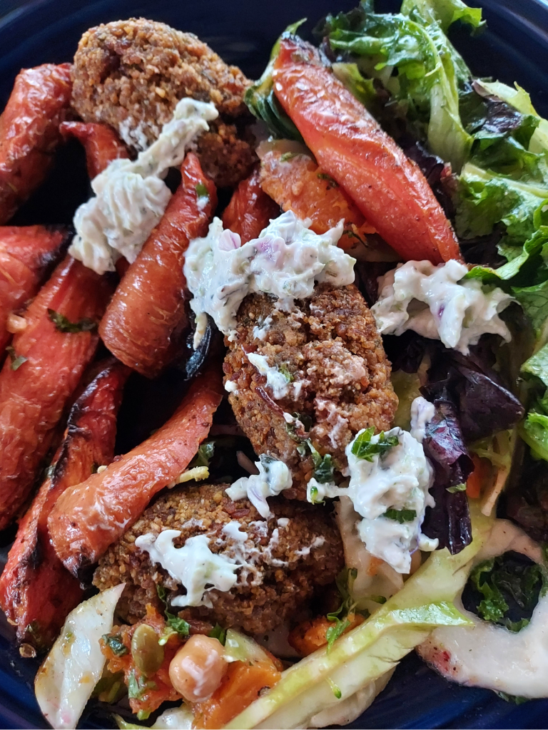 So for my first shared recipe post of 2026, I wanted to give the details of a salad recipe I’ve been enjoying in recent days/weeks – and one that is completely customizable based on your tastes and preferences (the one pictured, for example, also features some leftover maple-glazed carrots I had in my fridge on top of the other ingredients noted below.)