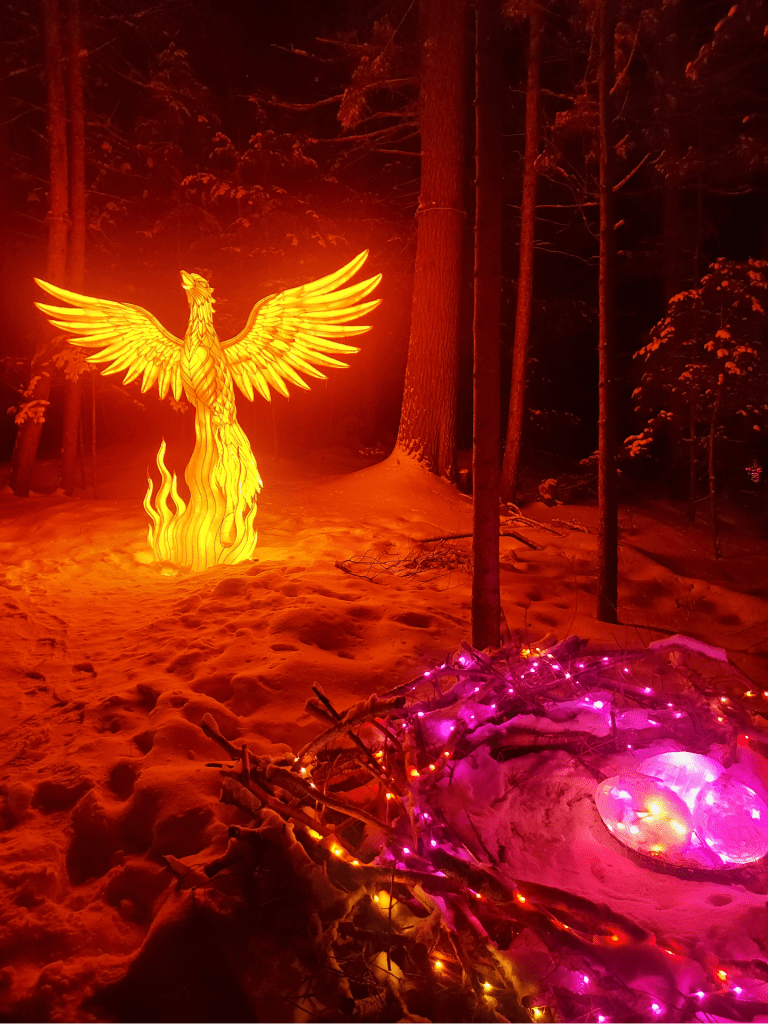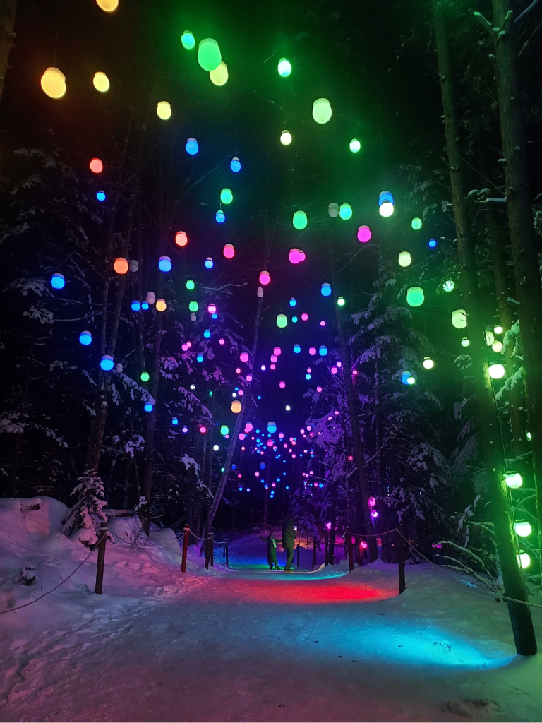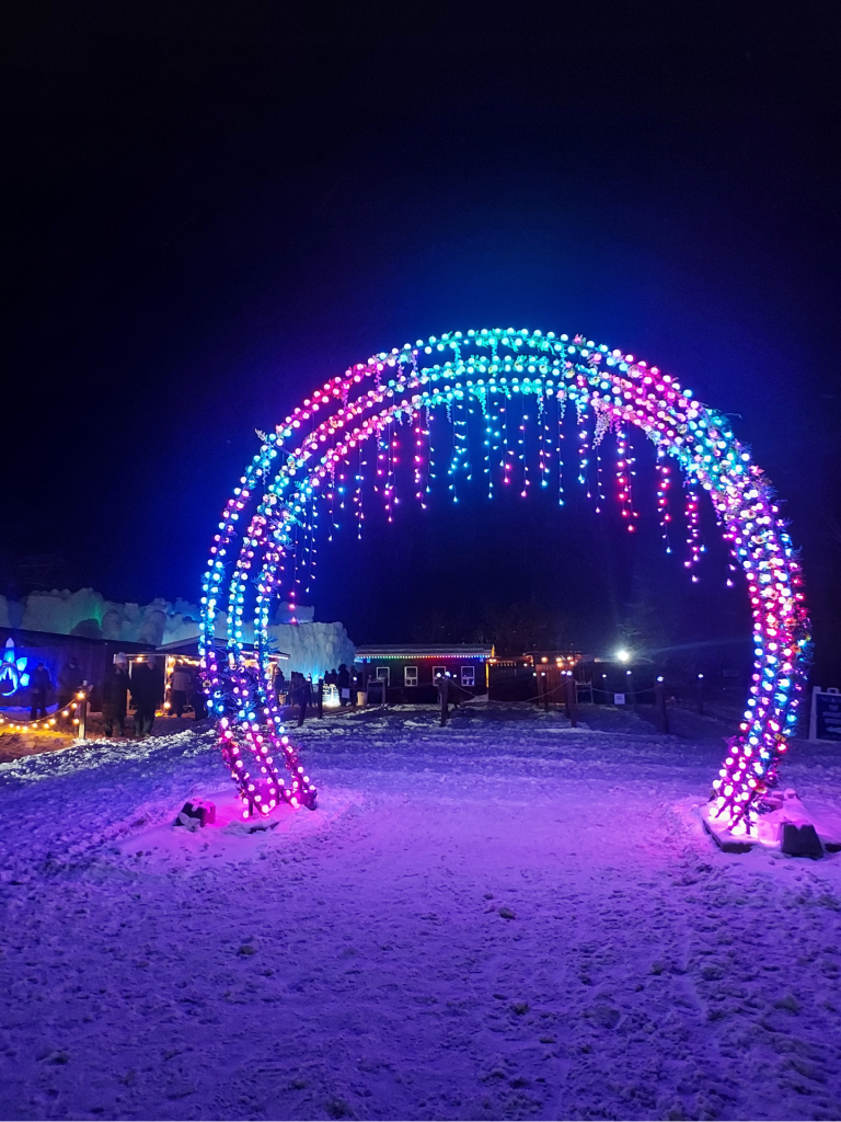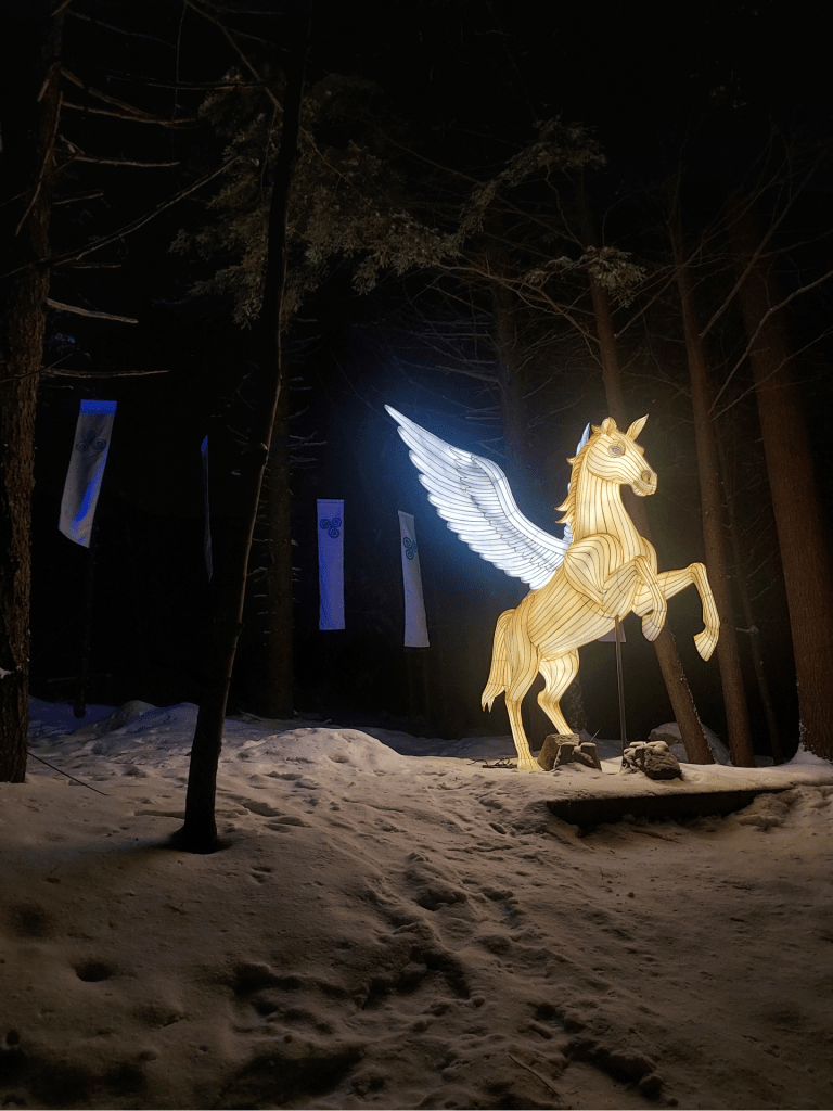 There were vendors selling hot drinks, an area for tubing, and horse-drawn sleigh rides to check out. There was also a beautiful trail with an elemental theme that we walked through, but what made the trip all the more fun was that it started snowing heavily while we were there – which only added to the overall splendor of the evening!