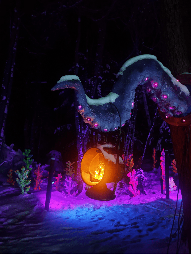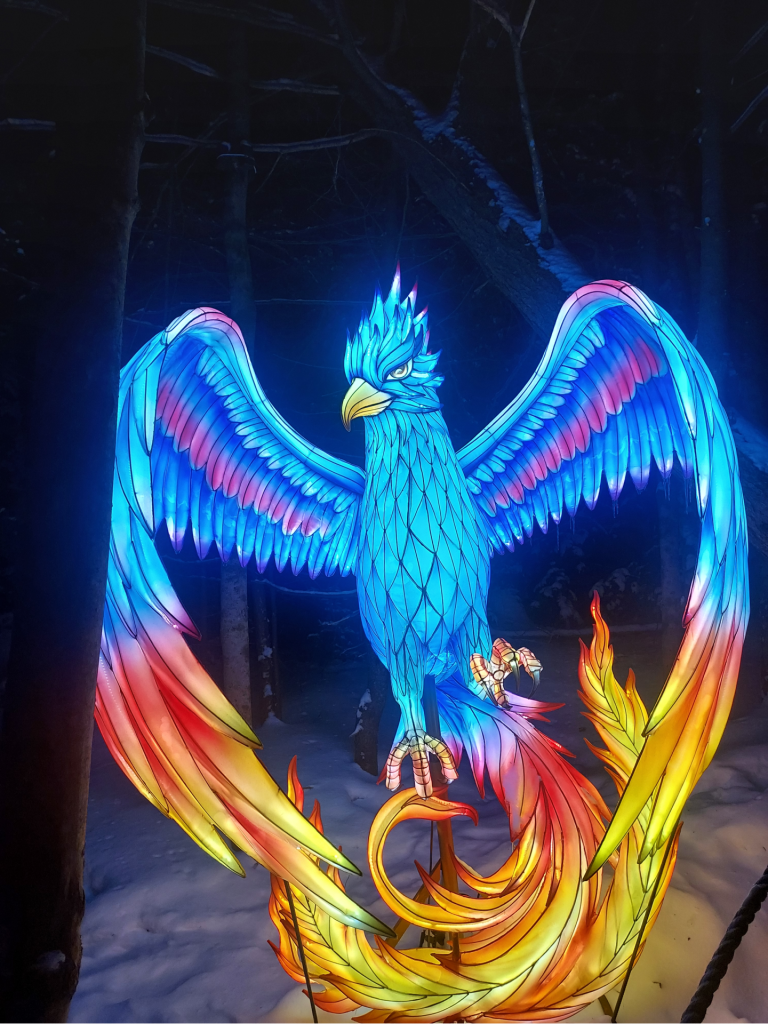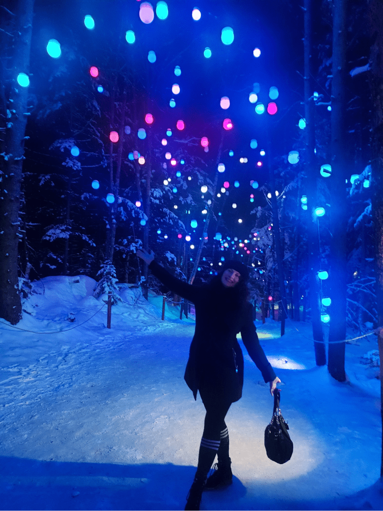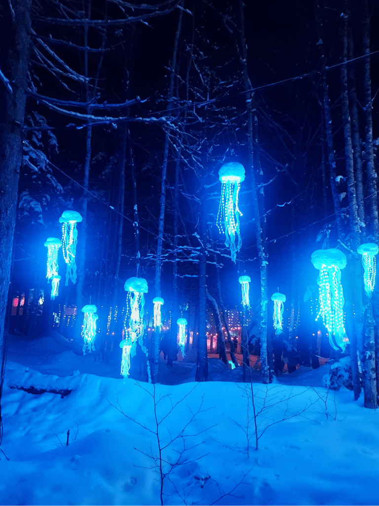 There were vendors selling hot drinks, an area for tubing, and horse-drawn sleigh rides to check out. There was also a beautiful trail with an elemental theme that we walked through, but what made the trip all the more fun was that it started snowing heavily while we were there – which only added to the overall splendor of the evening!