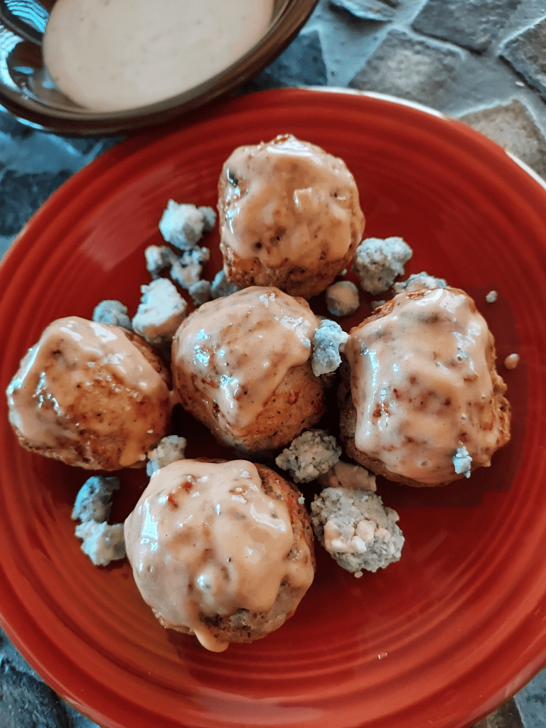 5. Serve the meatballs warm with a side of blue-cheese dressing or topped with the crumbled blue cheese (if using). The meatballs can be made up to two days ahead and gently reheated on the stove or in the microwave.