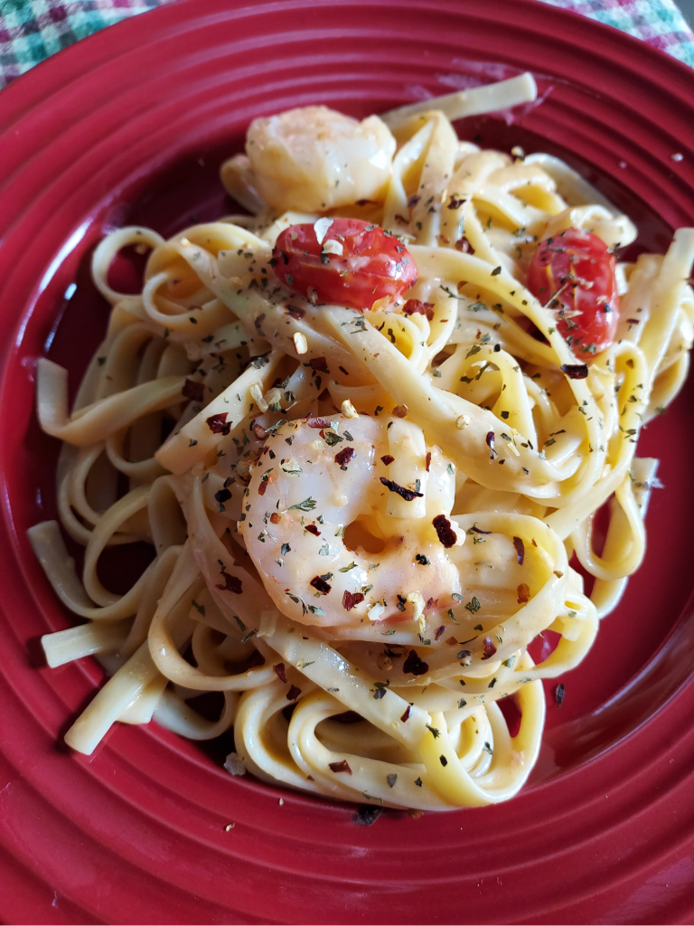 While celebrating a belated Galentine’s Day with my mother this past weekend where we participated in a mimosa-filled candle making class, I also took on the project of whipping up a delicious and filling dinner for the two of us once I’d brought her back to her house and was preparing to head home to my apartment for the evening. Like me, my mother also loves shopping at Trader Joe’s – and when I saw a couple of unopened ingredients she had in her fridge from a recent outing – I decided to put together a quick and easy seafood-loaded pasta recipe that is perfect for your Valentine, Galentine, or just for you if you’re in the mood (and you’ll have plenty of leftovers!)