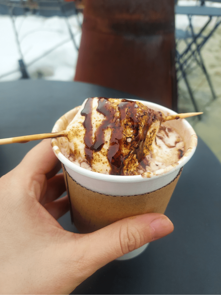 Whenever I’ve been to Julien’s, there’s always a line outside the door, and for very good reason – everything is absolutely delicious and, more often than not – too-pretty-to-eat! I grabbed a handful of chocolate croissants, pistachio pastries, and doughnuts to split with my mother before we parted ways to hunker down for the storm. I also got myself a hot chocolate with one of Julien’s famous homemade marshmallows to enjoy by the outdoor stoves for a while, which was a delicious pause in my day!