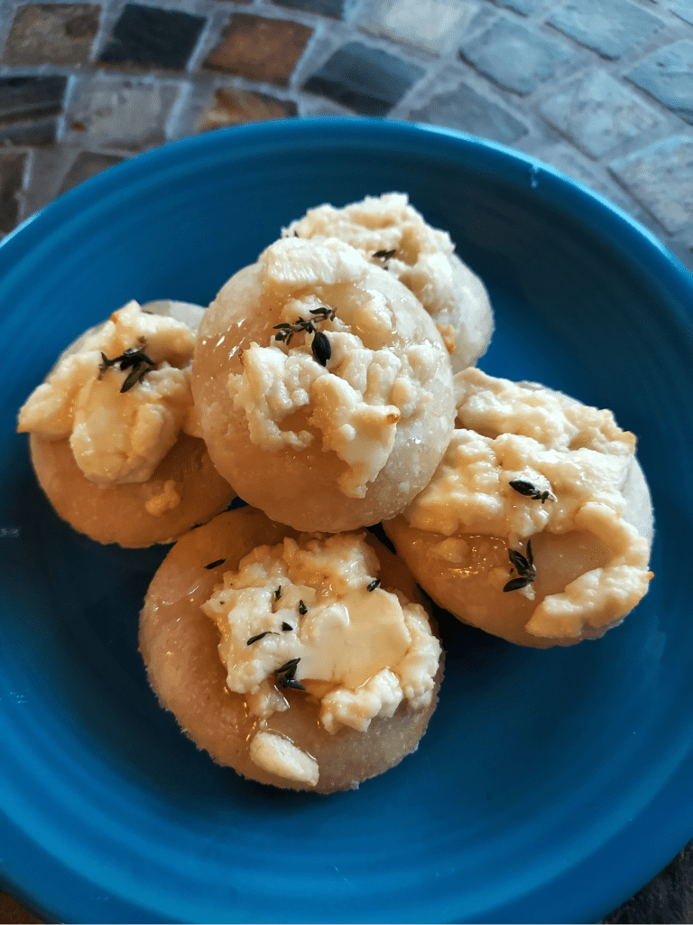 Of course, we have to stay fed and hydrated, so I’ve been whipping up an array of snacks to get us through the torrential downpours and occasional snow showers – including this quick and easy appetizer that beautifully combines the savory taste of goat cheese with sweet honey – a perfect duality for those who love a little bit of both the way I do!