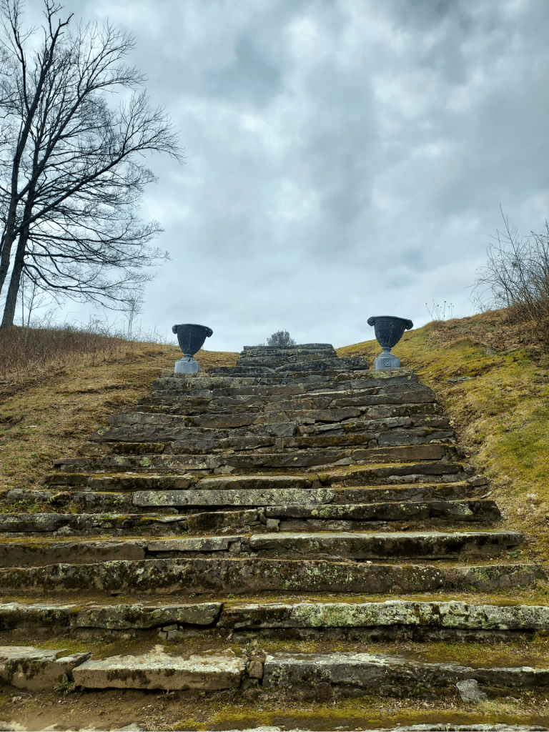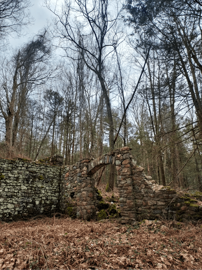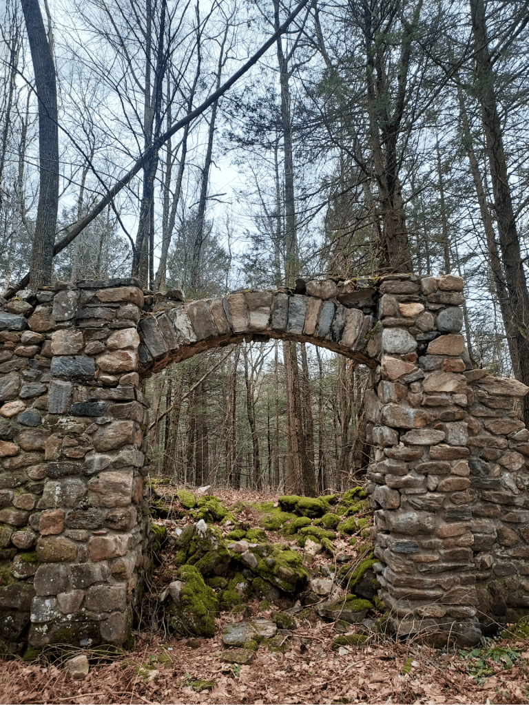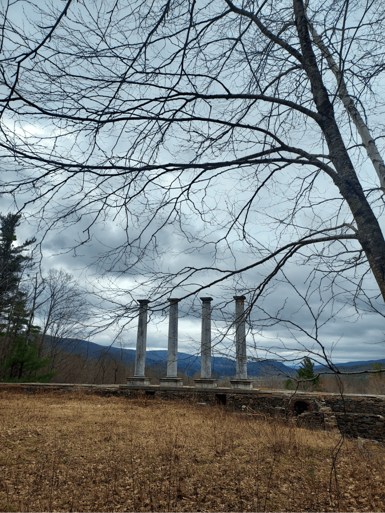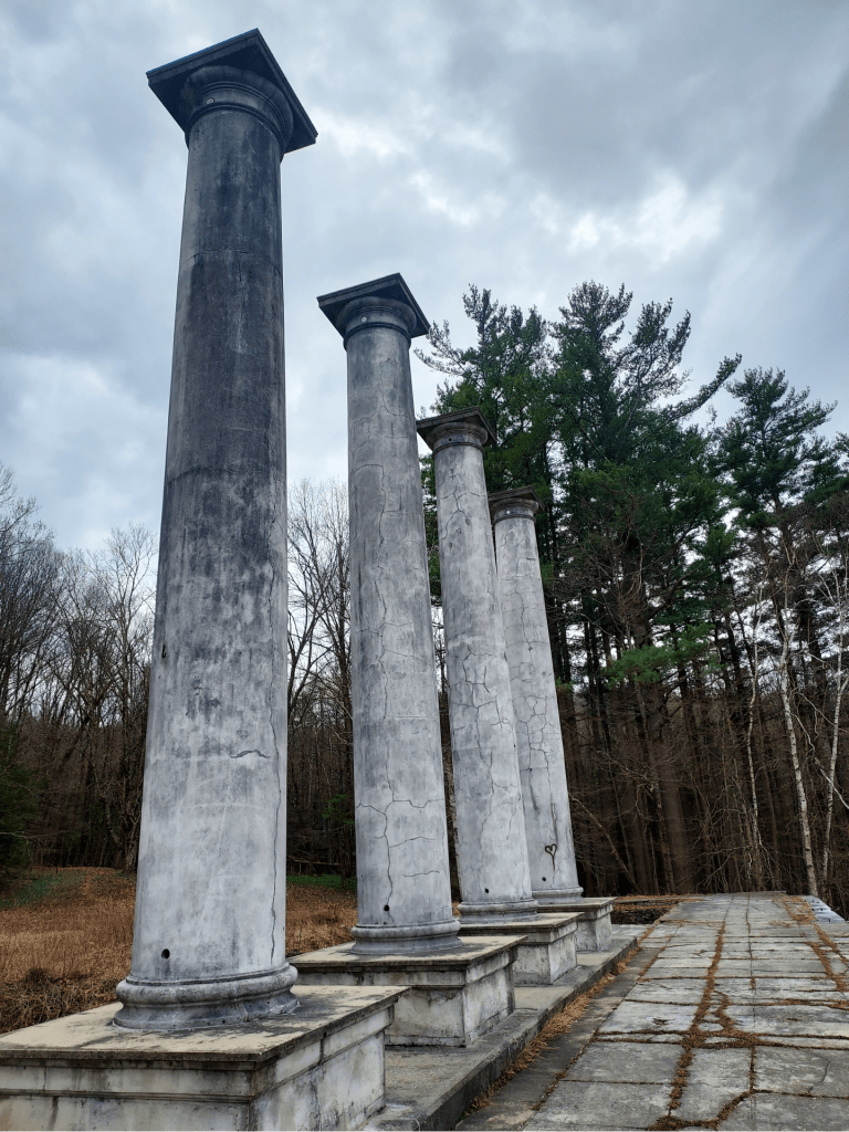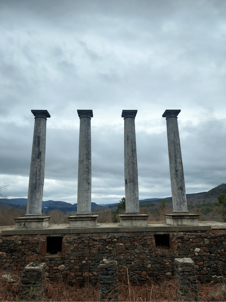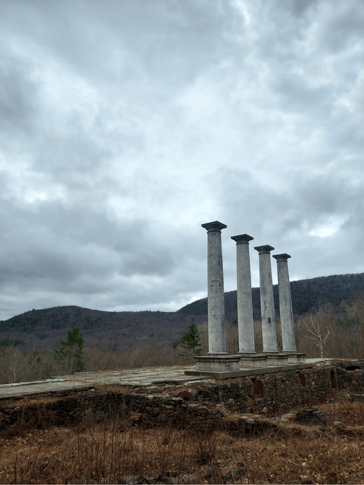 For example, we had recently taken an afternoon hike out in the Berkshires where we came across the ruins of Ashintully Gardens – a former early 20th century mansion located on the hillside in Tyringham, Massachusetts. All that remains over the years of it being abandoned, a fire that roared through the area many years ago, and the elements slowly but gradually reclaiming the land are scattered pieces of the foundation and four huge, ominous columns that still stand tall.