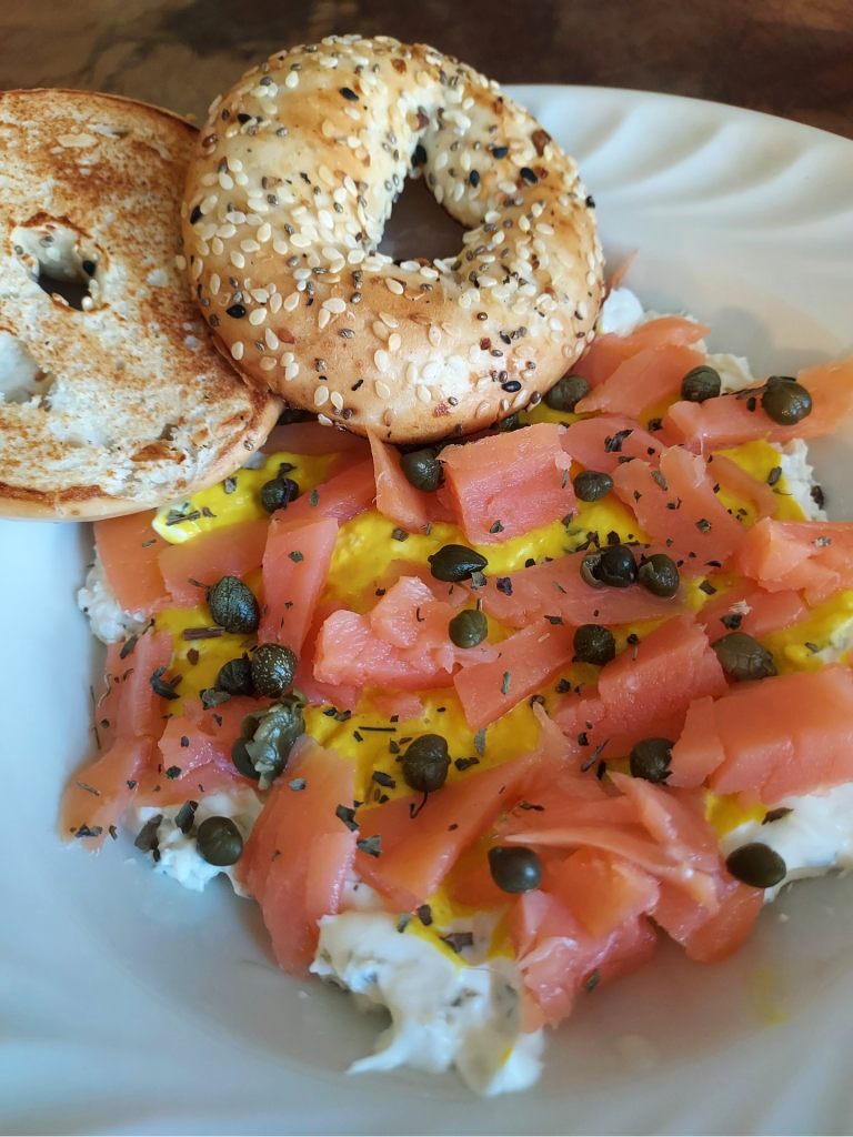 I love the flavor combination of this one, especially since the cream cheese calms the kick from the horseradish down just enough and both the capers and salmon are such a great, salty blend together when they’re spread on the toasted everything bagels. You can also layer the ingredients however you want and it will still taste great (that’s what I did, anyway!)