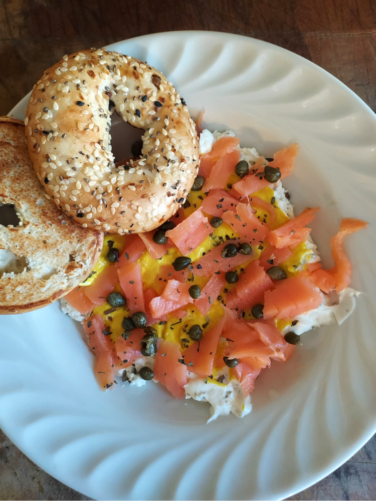 I love the flavor combination of this one, especially since the cream cheese calms the kick from the horseradish down just enough and both the capers and salmon are such a great, salty blend together when they’re spread on the toasted everything bagels. You can also layer the ingredients however you want and it will still taste great (that’s what I did, anyway!)